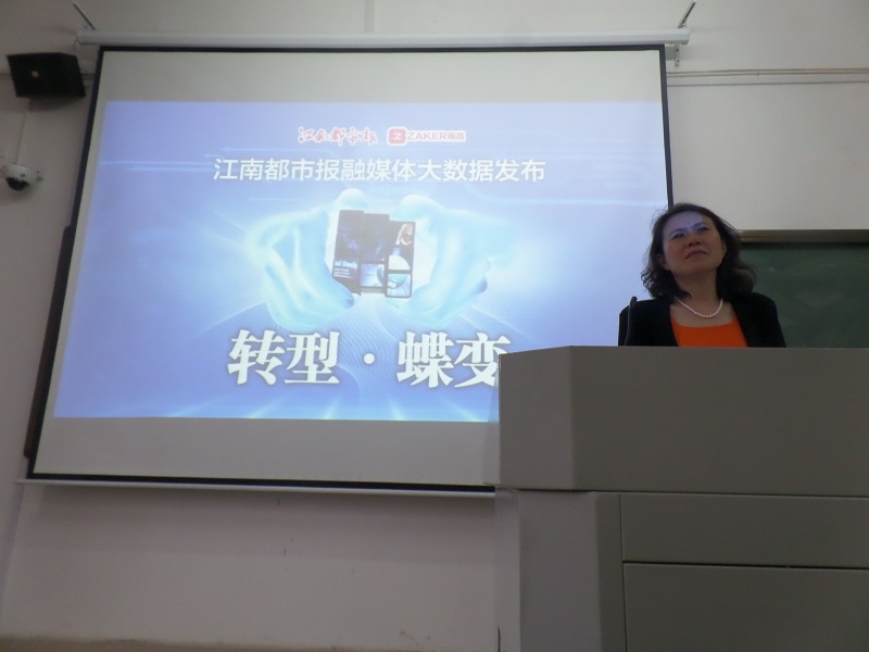 朱晓晖总编开门见山,先提出“融媒体”这一概念,她从大数据入手,指出了传统媒体与当今融合了全新的技术、覆盖面更为广泛的新媒体的不同之处,紧接着围绕着大数据所呈现的变化,引导出“大转型”的主题。她强调,她所说的大转型包括记者转型与内容转型两大部分。为了让同学们能够更深刻地明白这其中的差异,她结合生动而具有代表性的实例来讲转型前后的明显不同。最后朱总编强调转型的诀窍就在于创新与融合。她指出,江南都市报由原先的传统媒体体系逐渐发展成为如今包含报纸宣传、新媒体运营、旅游项目、会展经济等等多形态运营体系。因为抓住了时代发展的趋势,不拘泥于传统发展模式,所以能够成功实现深度的融合,在短暂的低迷以后走向新的辉煌!