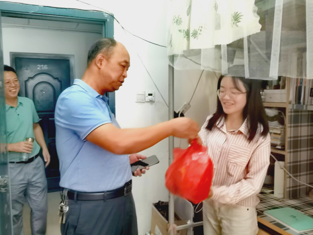在走访慰问过程中,汪书记、肖主任一同为留校学生送上定制月饼、柚子、花生等礼物,代表学院送上祝福,小饼如嚼月,中有酥和饴,学院的关怀伴随着小礼物一起,甜到了留校学生们的心底。