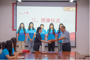 接着,汪贵德为即将出征师生授予团旗和队旗。鲜红的旗帜在会场传递,映照着每一位队员坚毅的脸庞。接过旗帜的瞬间,队员们深感重任在肩,服务基层、奉献社会的信念更加坚定如磐。