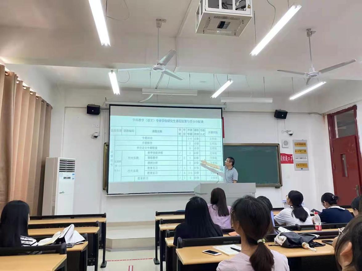 开始,周榆华教授向新入学的2021级研究生介绍《学科教学(语文)专业人才培养方案》实践环节的课程设置、学分和开课学期,为大家详细解读各课程的实践内容、要求和注意事项,让大家做到心中有数,合理安排。