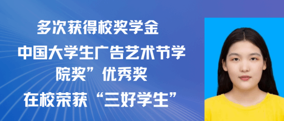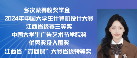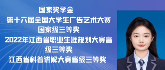 朱芯仪,女,中共党员,2021级广告学专业(含职教师范)班。曾担任班级团支书、党建中心综合事务部部长等职务。在校期间曾获得国家奖学金,荣获“三好学生”“优秀学生干部”等荣誉称号。在第十六届全国大学生广告艺术大赛中获得国家级三等奖,在2022年江西省职业生涯规划大赛中获得省级三等奖,在2021年江西省科普讲解大赛中获得省级三等奖。现已取为浙江传媒学院硕士研究生。