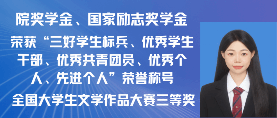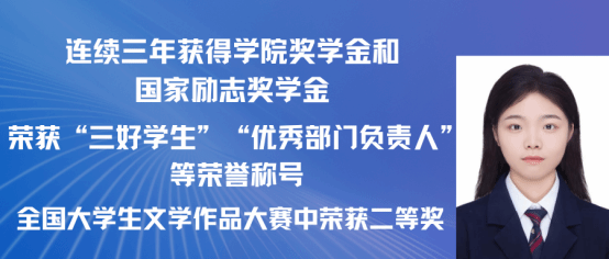 刘诗颖,女,中共预备党员,2021级汉语言文学专业(师范)一班。本科期间曾担任校学生会媒体宣传部部门负责人。荣获第十九届全国大学生写作大赛三等奖、第十八届江西省写作大赛三等奖、2023年中央广播电视总台七夕特别节目优秀志愿者、2022“外研社·国才杯”全国英语演讲大赛校级一等奖2021-2022年度“三好学生”称号。现已录取为南京师范大学研究生。