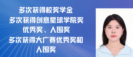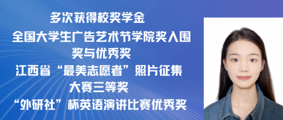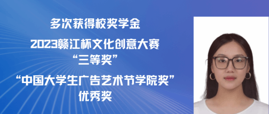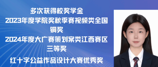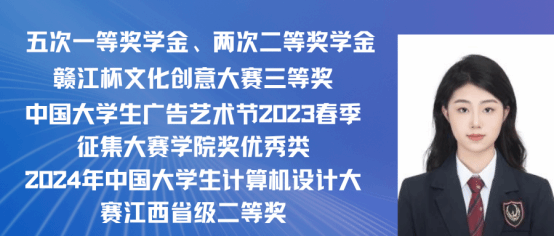 黄怡,女,中共党员,2021级广告学专业(含职教师范)班。本科期间四年平均绩点4.14/5.0,位于专业第一。在校期间荣获两次一等奖学金、两次二等奖学金、两次三等奖学金。多次获得“三好学生”“先进个人”“优秀志愿者”等称号。在2023年度学院奖秋季赛中荣获视频类全国铜奖、在2023年度中国国际大学生创新大赛中荣获校赛铜奖、在2024年度大广赛中荣获策划案类江西赛区三等奖、在2024年江西省红十字公益作品设计大赛中荣获公益平面类优秀奖等,并获得若干学院奖优秀类和入围类。
