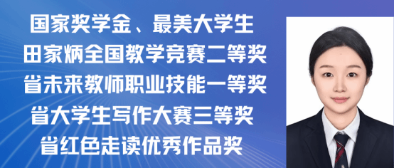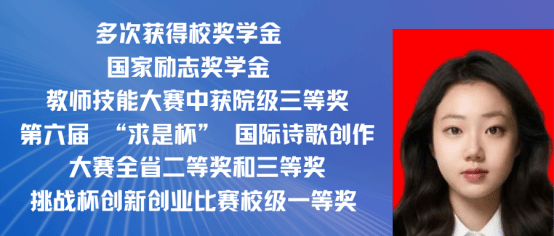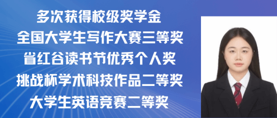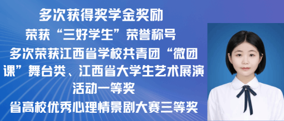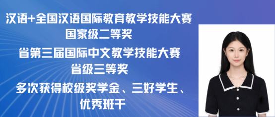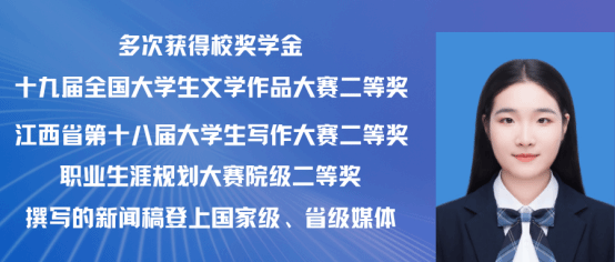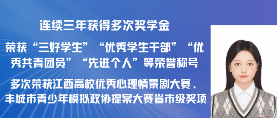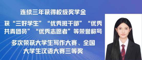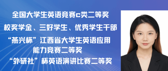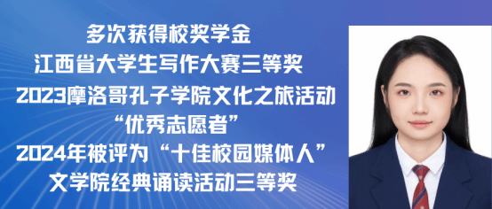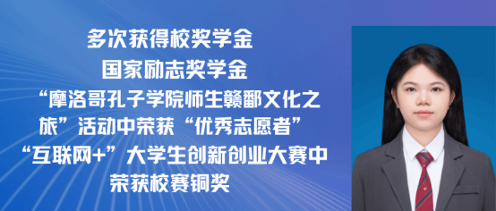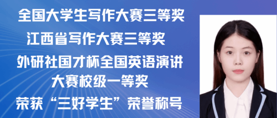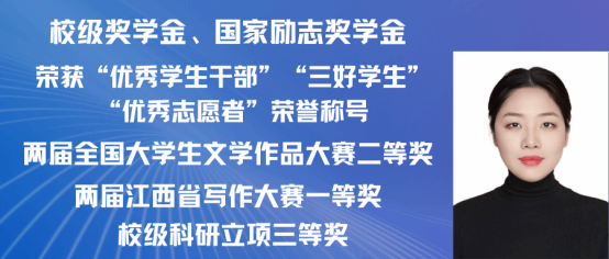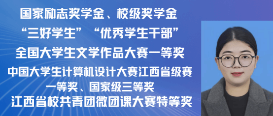 赵嘉怡,女,中共党员,2021级汉语国际教育专业一班,在校期间担任班长,曾获 “第三届汉语+全国汉语国际教育教学技能大赛”国家级二等奖以及 “江西省第三届国际中文教学技能大赛”省级三等奖。同时在校期间曾多次获得校级奖学金,三好学生,优秀班干,现已考取北京师范大学攻读硕士研究生。现已录取为北京师范大学研究生。