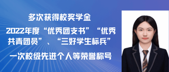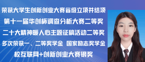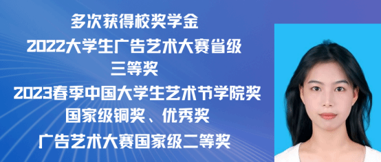 肖清清,女,共青团员,2021级广告学专业(含职教师范)班。本科期间曾担任寝室长等职务。荣获一次二等奖学金、三次三等奖学金、“三好学生”荣誉称号、在2022-2023年多个创意星球学院奖、大广赛优秀奖、入围奖。现已录用为永丰县务员。