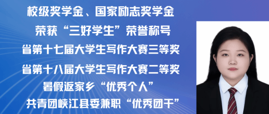 王洋,女,中共党员,2021级汉语言文学专业(师范)二班,荣获国家励志奖学金、五次校级奖学金、两次“三好学生”荣誉称号、江西省第十七届大学生写作大赛三等奖、江西省第十八届大学生写作大赛二等奖、吉安市2023年暑假“返家乡”社会实践活动“优秀个人”、共青团峡江县委2023年度兼职“优秀团干”。