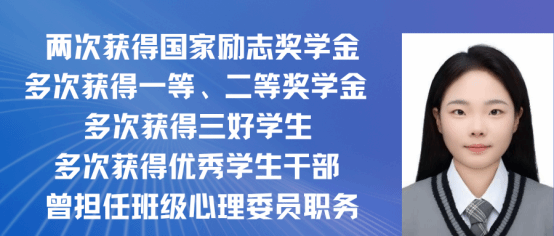夏怡萍,女,共青团员,2021级广播电视学专业一班。在校期间曾担任班级心理委员职务,连续两年获得国家励志奖学金,多次获得一等、二等奖学金以及“三好学生”“优秀学生干部”等荣誉称号。