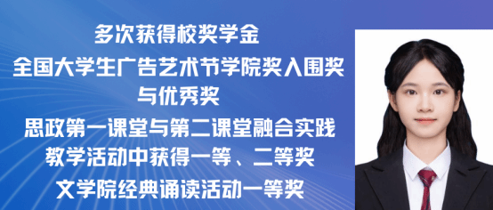 王婷,中共党员,2021级广告学专业(三校生)班。本科期间曾担任班级团支书职务。荣获四次学校奖学金、获“优秀学生干部”荣誉称号、2022大学生广告艺术大赛文案类比赛省级三等奖、2023春季中国大学生艺术节学院奖视频类比赛国家级铜奖、多次优秀奖、2024第16届全国大学生广告艺术大赛视频微电影广告类比赛国家级二等奖。