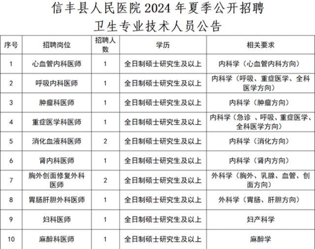 3.网络报名:材料扫描发送至信丰县人民医院人事科邮箱:xfxrmyyrsk@126.com(邮件主题以岗位名称+姓名+专业)。4、报名须提供的相关材料:①个人简历、有效证件(身份证、学历、学位、执业证、职称等证书)等;