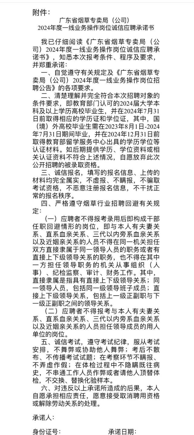 附件:广东省烟草专卖局(公司)2024年度一线业务操作岗位诚信应聘承诺书