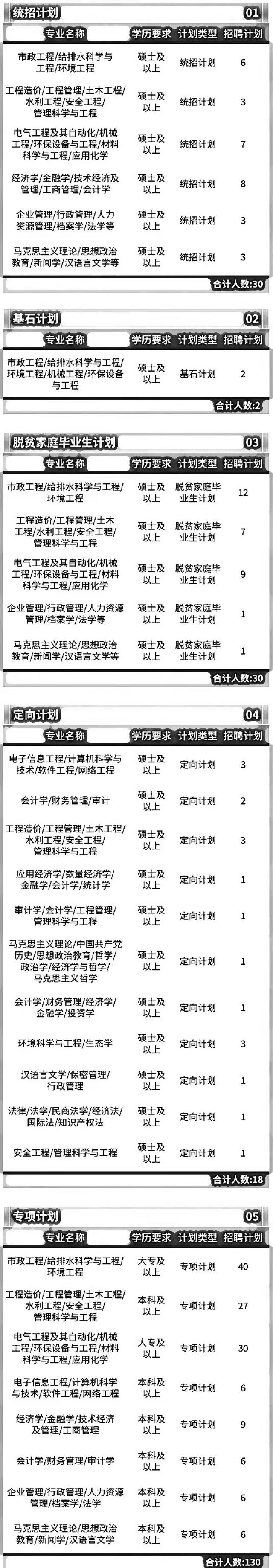 符合招聘条件地专业类别:生态环保类、土木工程类、经济管理类、电气工程类、信息技术类、企业管理类以及思想政治类等。