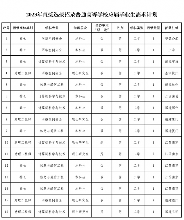 为深入贯彻习近平总书记关于军民融合发展重大战略思想,推动军地合力培育军事人才,现将信息通信部队某部2023年直接选拔招录普通高等学校应届毕业生有关事项公告如下: