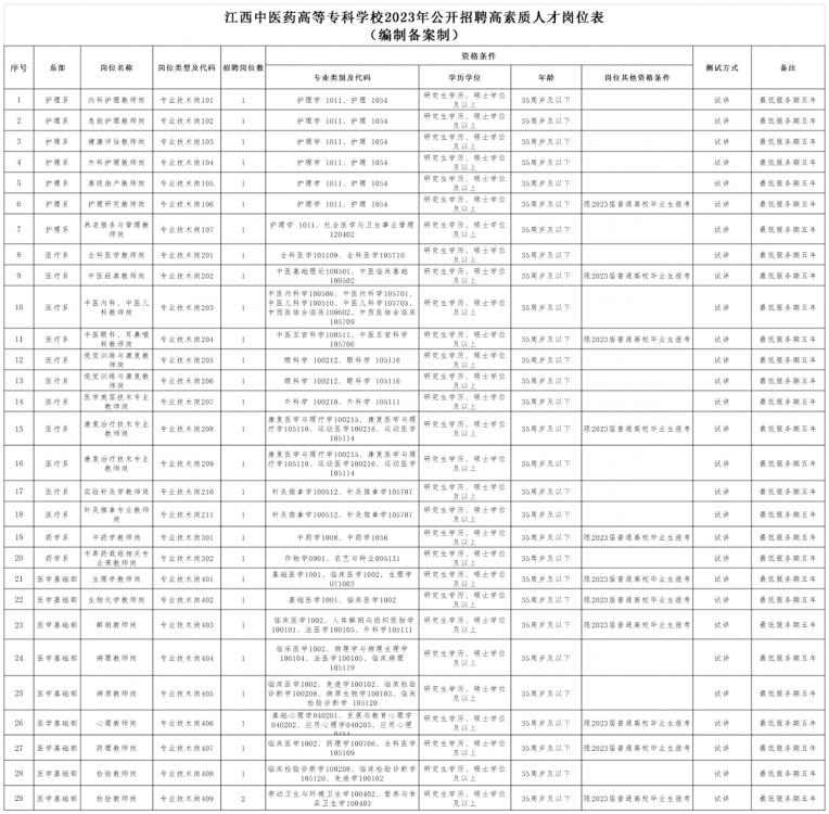 1. 招聘岗位及具体条件详见《江西中医药高等专科学校2023年公开招聘高素质人才岗位表》