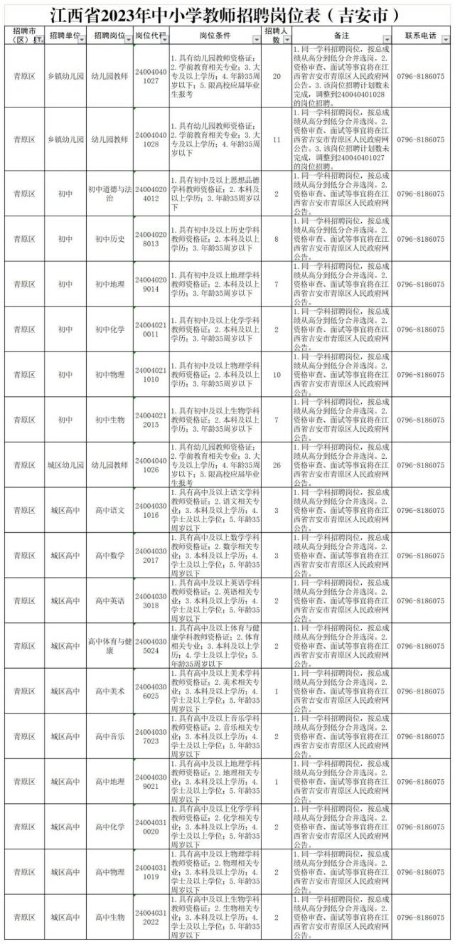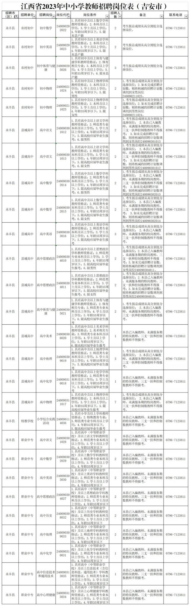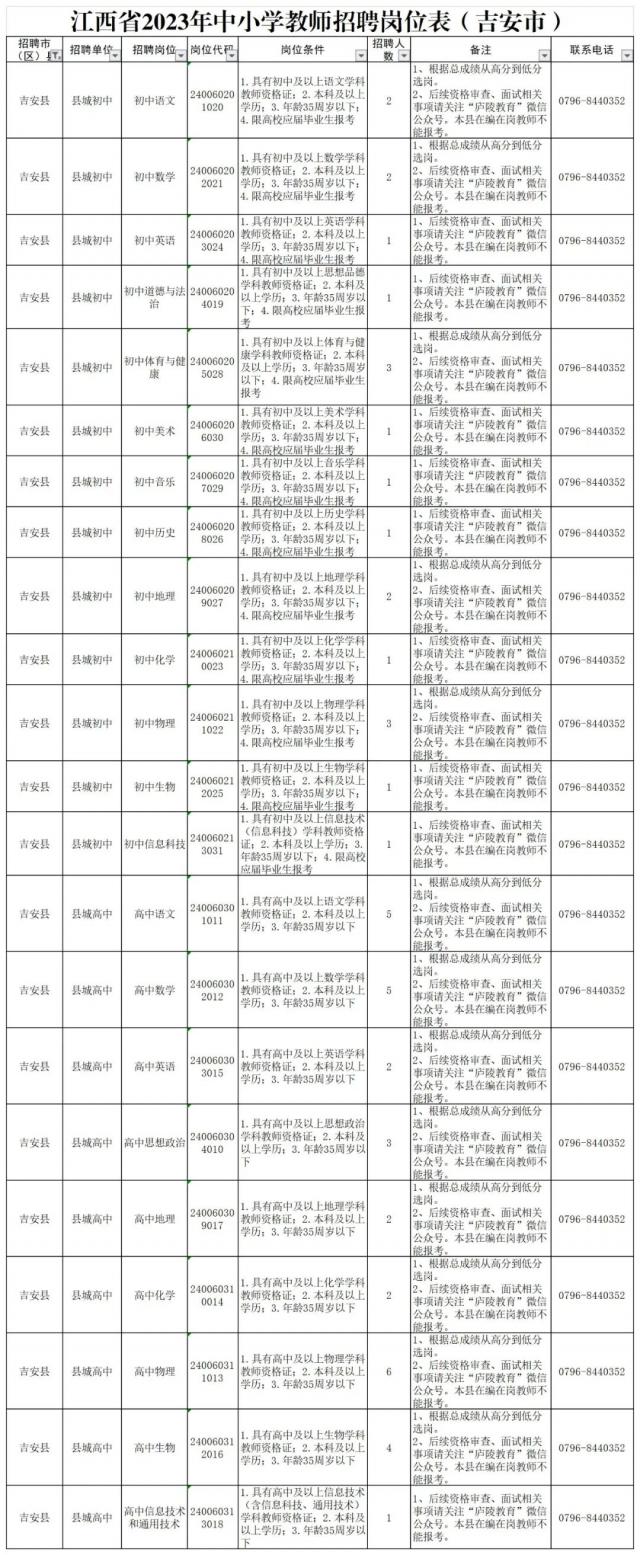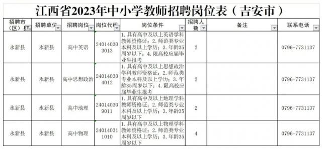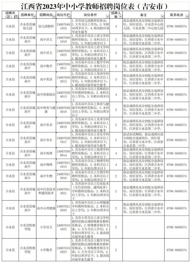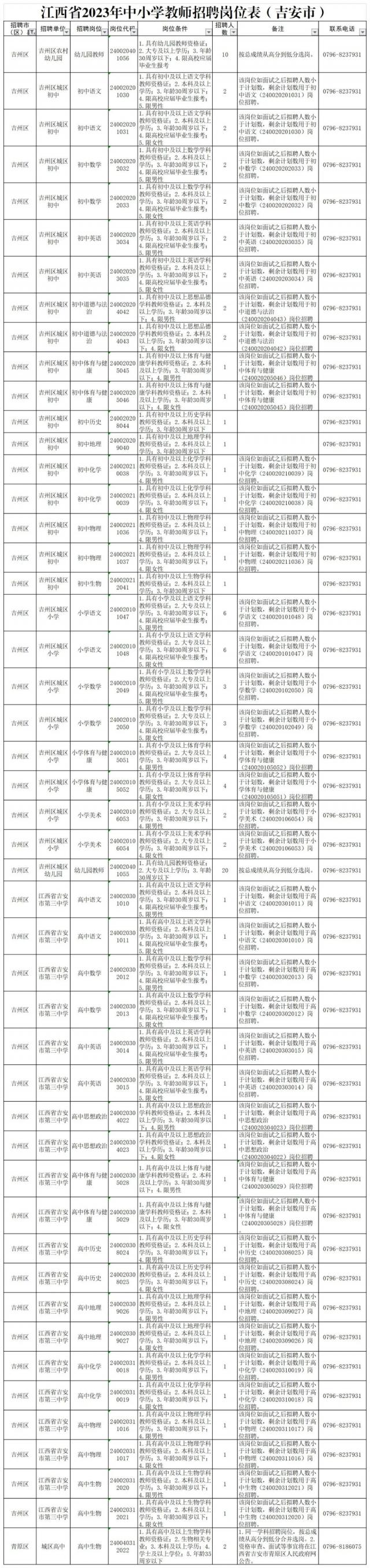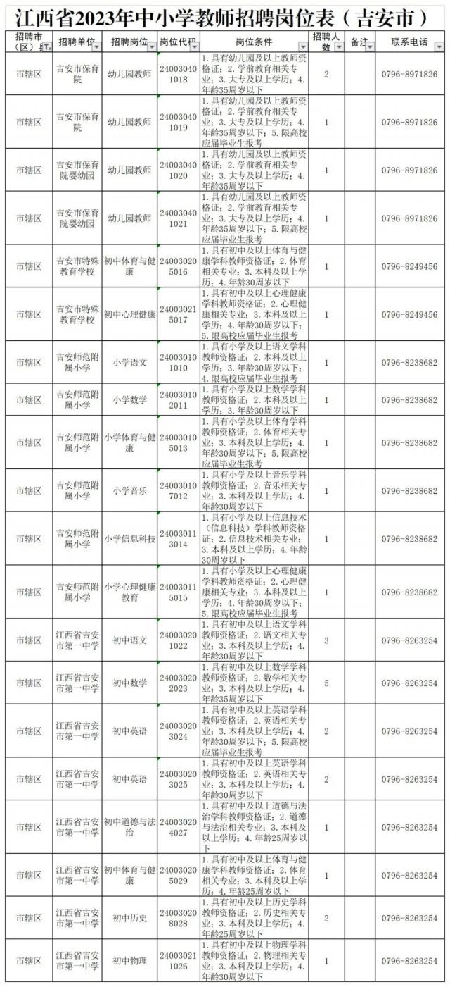 近日省教育厅、省人力资源和社会保障厅发布《江西省2023年中小学教师招聘公告》《江西省2023年“农村义务教育阶段学校教师特设岗位计划”教师招聘公告》2023年全省中小学教师招聘计划共7821名其中,吉安市招聘734名,2023年全省中小学特岗教师招聘计划共3146名,其中,吉安市招聘311名。