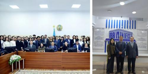 访问期间,陈院长代表学校与哈萨克斯坦国立师范大学共同签署了合作谅解备忘录,并就2+2双学位联合培养项目、师生交流机制、科研合作等双方感兴趣的合作领域进行了深入的探讨和交流。此外,陈绪平副院长应邀为哈萨克斯坦国立师范大学师生作主题报告,报告主题为“论数字时代国际中文教育的海外合作方法与实践路径”。万书言博士、余超博士围绕着“汉字的特点、学习方法以及数字化技术在汉语教学中的应用”这一主题进行了教学展示。