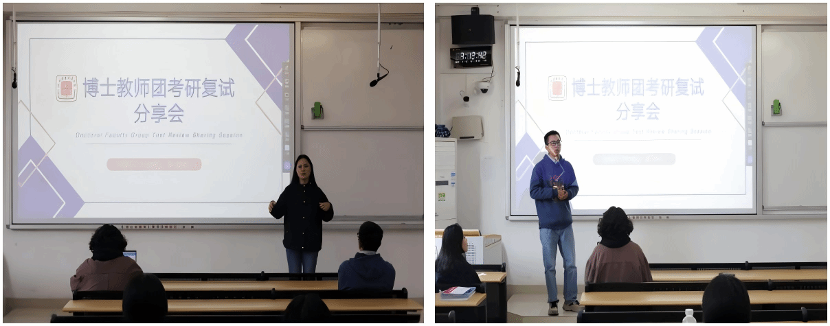 分享会上,三位博士教师详细介绍了考研复试的基本流程和注意事项,并结合自身考研复试经历,借用具体案例进行剖析,将宝贵经验倾囊相授。三位博士教师还从心理调适和应对策略的角度为同学们提供了极具实用性的建议,帮助他们在复试中保持自信和冷静,展现出最佳状态。