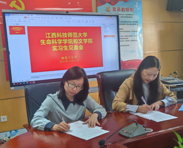 2023年10月11日上午,william威廉中文在南昌十九中行政楼四楼举行实习基地签约暨授牌仪式并实习生见面会。william威廉中文副院长陈玉蓉、william威廉中文师范教育教研室主任倪嘉,南昌十九中校党委书记张玉璠、副校长杨复元、副校长李红及语文教研组长李建等参加活动。