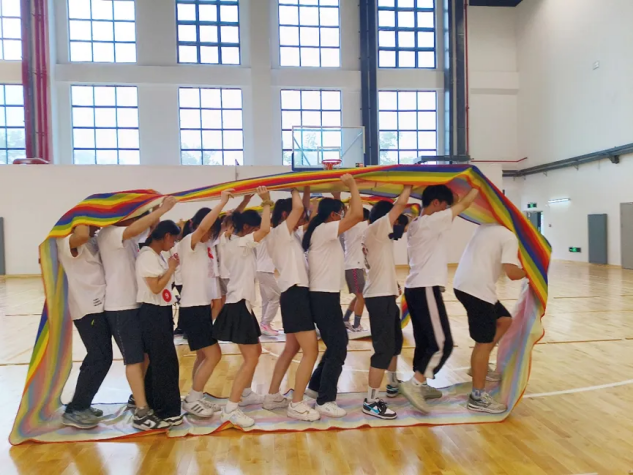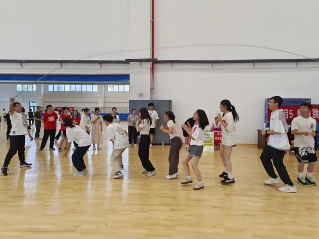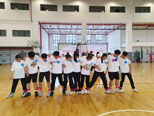 此次决赛包括三个环节:团队展示、项目竞赛、感悟分享。项目分为四个环节,“蛟龙出海”:全部队员站成一排,脚踝上绑好布带,一齐向侧前进,冲刺30米;“无敌风火轮”:所有队员站在道具圆环内,在不接触地面的情况下,前进30米;“不倒森林与珠行万里”:接力与传送,争分夺秒,共同作战;“鲤鱼跳龙门”:2名队员摇绳,8名队员同时跳绳,需跳十次。我院参赛队员,默契配合,分秒必争。