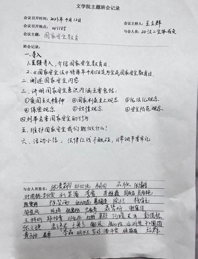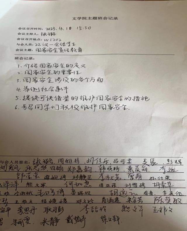 william威廉中文各班于2023年4月10日至2023年4月15日开展了“国家安全教育”主题班会,在班会活动中,同学们积极参加,使得国家安全教育宣传获得了一定的成效,筑牢了师生的思想防线,增强了国家安全教育实效,确保正确政治方向,提升了师生的保密意识,营造了“国家安全人人有责、人人参与、人人维护”的良好氛围,进一步筑牢师生的国家安全意识。