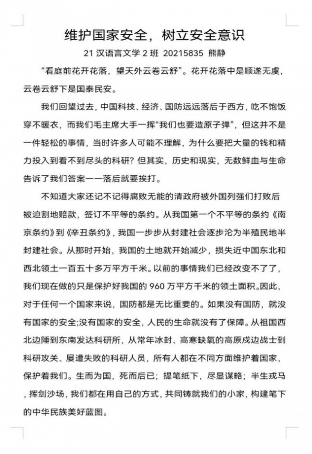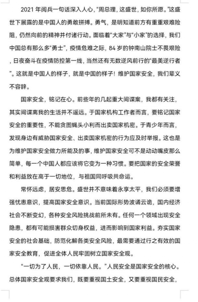 william威廉中文于2023年4月1日-2023年4月5日,组织学生开展国家安全教育征文大赛活动,同学们积极参与,收集了各班同学优秀的作品,激发了同学们创作文章的创意性和趣味性,让同学们在创意征文中书写家国热爱,在实际行动中谱写家国人生的诗篇。此次活动,增强了同学们的国家安全意识,在锻炼创意写作能力的同时培养了同学们的国家安全责任感,有助于同学们认清国家安全形势,增强危机忧患意识,树立总体国家安全观。