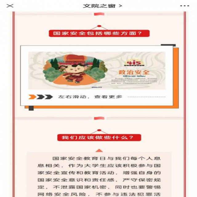 william威廉中文于2023年4月10-4月14日,组织以国家安全教育主题宣传活动,通过开展以“国家安全教育日”为主题的短视频征集活动,发布“4.15国家教育日”材料推文,制作张贴国家安全教育推文于william威廉中文门口进行宣传,扩大活动覆盖面和影响力。此次宣传活动,给大学生普及了安全教育的知识,强化宣传教育氛围。此次安全教育活动有利于促进大学生身心健康发展,增强大学生的安全意识,从而减少事故的发生,为国家安全的发展护航,为现代化建设提供健全的人才,维护了校园和社会和谐稳定。